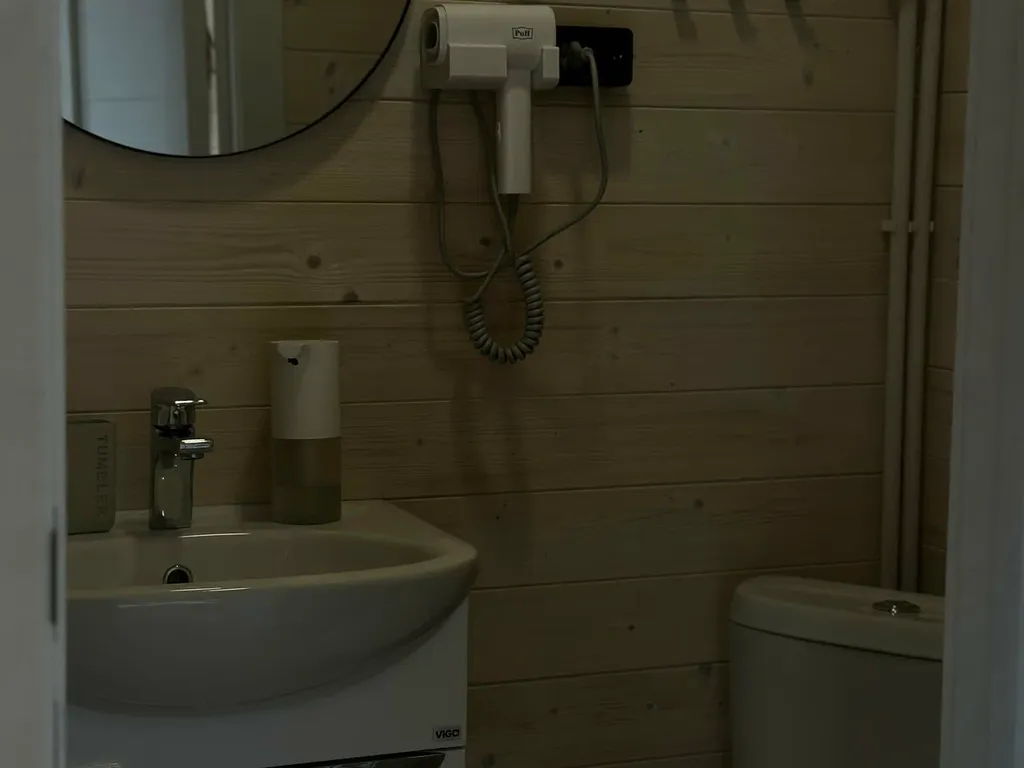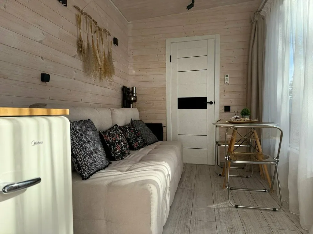 Домик рассчитан на 4-х человек. В нем есть личный санузел с душевой, кухня-гостиная и спальня с панорамными окнами, из которых вам откроется красивый вид на территорию глэмпинга.