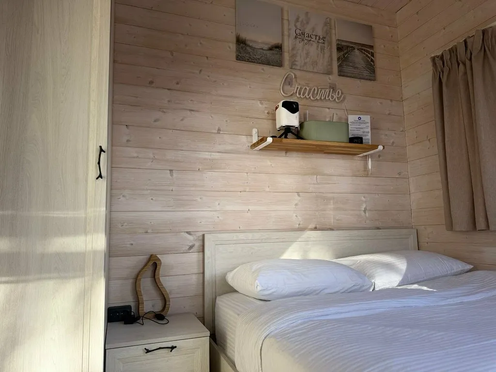 Уютная спальня, где вы сможете провести замечательный вечер, смотря любимые фильмы на smart-проекторе. Мы подключили подписку в приложении «Кинопоиск», где найдете фильмы и сериалы на любой вкус. Двуспальная кровать с белоснежным бельем и премиальным матрасом создаст условия для комфортного сна. Умная Яндекс-станция «Алиса» создаст нужную атмосферу: включит любимые песни или расскажет сказки детям.