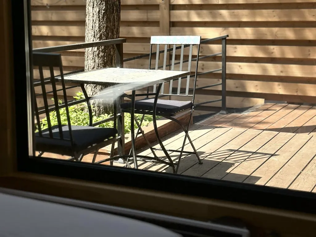 Своя терраса с пандусом, если вы приехали с детками на коляске. Уличная обеденная группа с зонтом, чан с гидромассажем сделают отдых на природе еще идеальнее. У домика «Графит» есть собственный огородик, в котором растут ароматные и полезные травы, благодаря чему в теплое время года вы сможете заварить вкусный чай из свежесобранных трав.