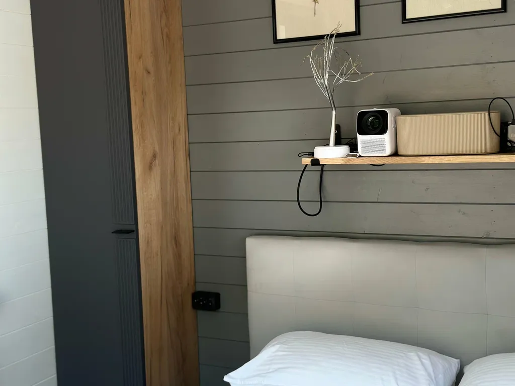 Уютная спальня, где вы сможете провести семейный вечер, смотря любимые фильмы на smart-проекторе. Мы подключили подписку в приложении «Кинопоиск», где найдете фильмы и сериалы на любой вкус. Двуспальная кровать с белоснежным бельем и премиальным матрасом создаст условия для комфортного сна. Умная Яндекс-станция «Алиса» создаст нужную атмосферу: включит любимые песни или расскажет сказки детям.