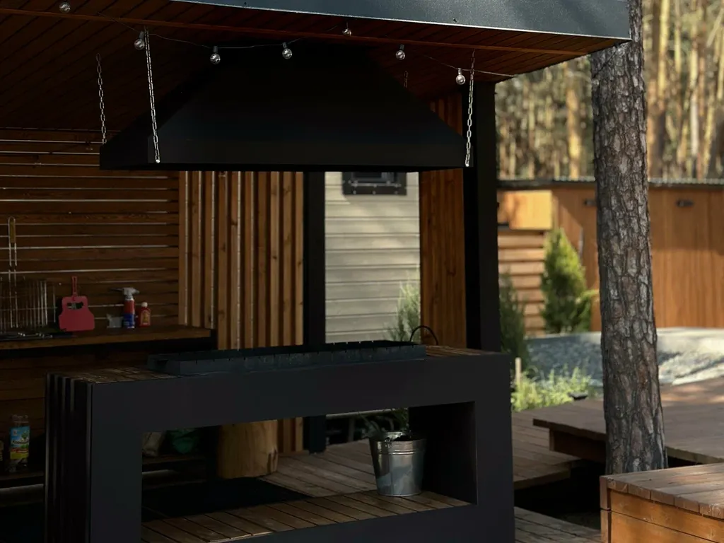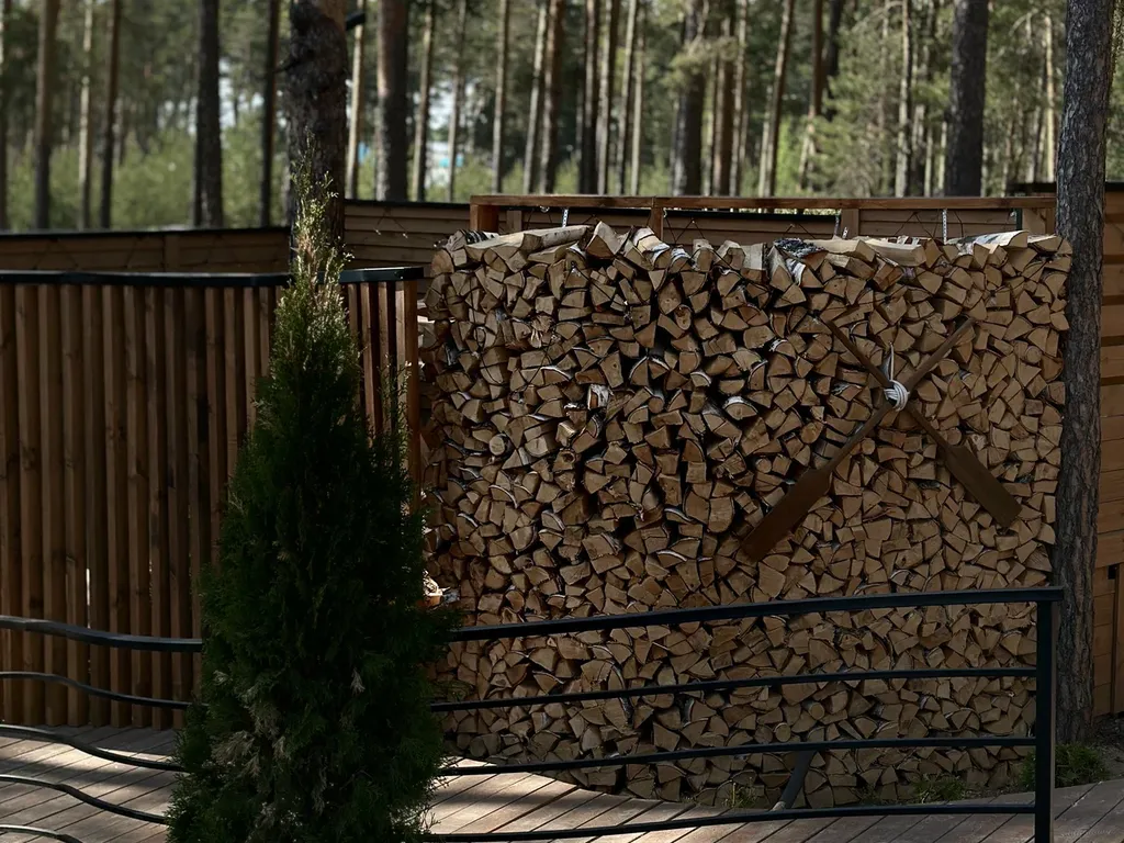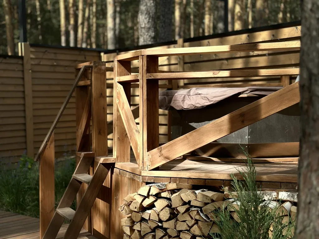У домика своя зонированная терраса с видом на сосновый лес. Прекрасное место для уединения.