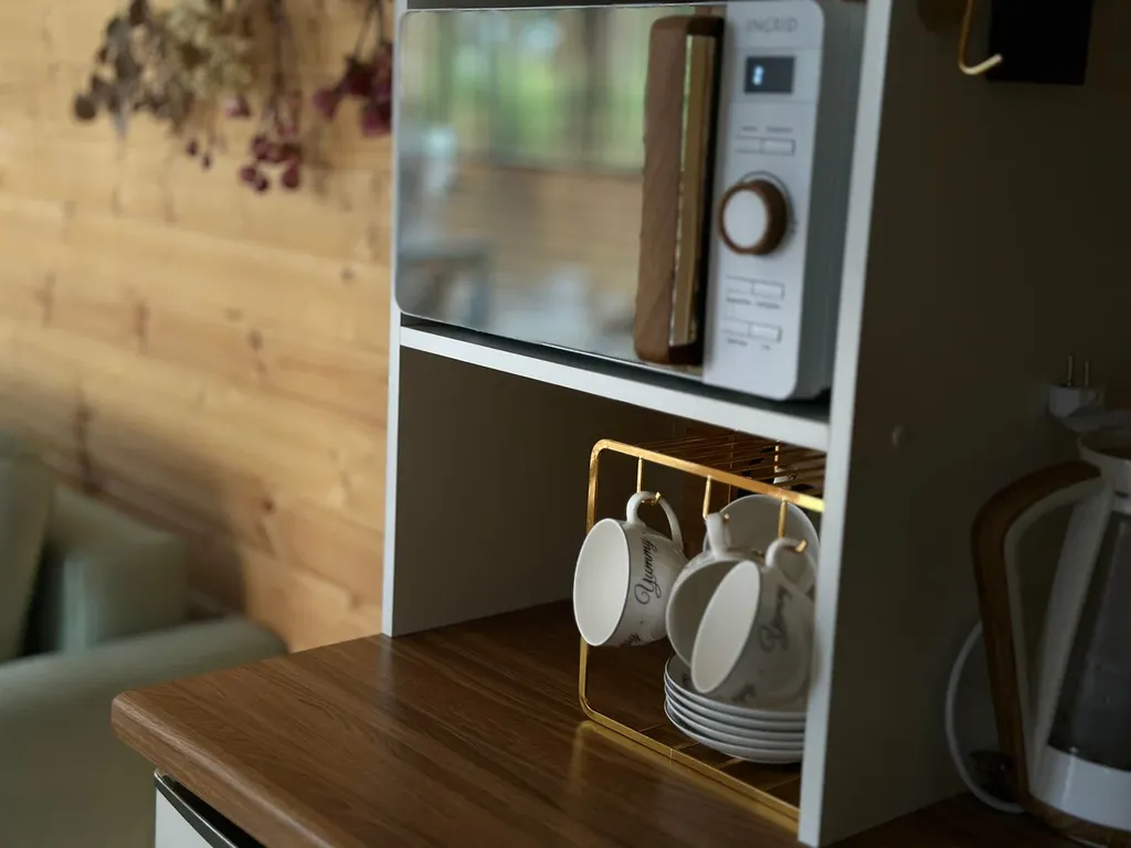 Кухня оснащена всем необходимым для комфортного проживания и приготовления еды: холодильник, микроволновка, электрический чайник, заварочный чайник, кухонные приборы, посуда на 6 персон, фужеры, салатник, сковорода, кастрюлька, индукционная плитка, соль, масло, чай и сахар.