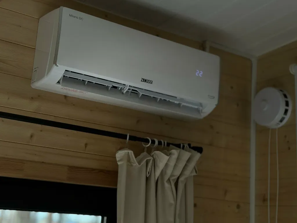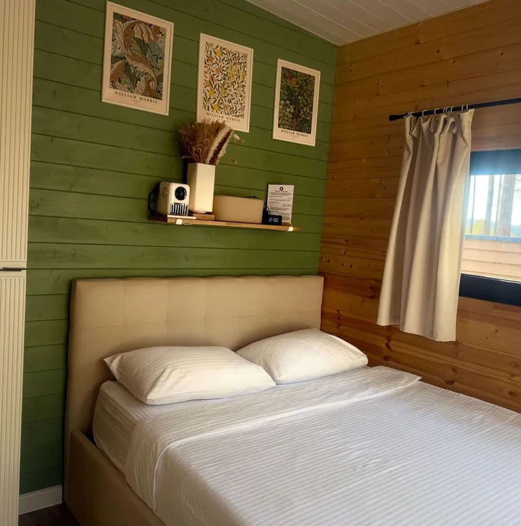 Домик рассчитан на 4-х человек. В нем есть личный санузел с душевой, кухня-гостиная и спальня с панорамными окнами, из которых вам откроется красивый вид на лес.